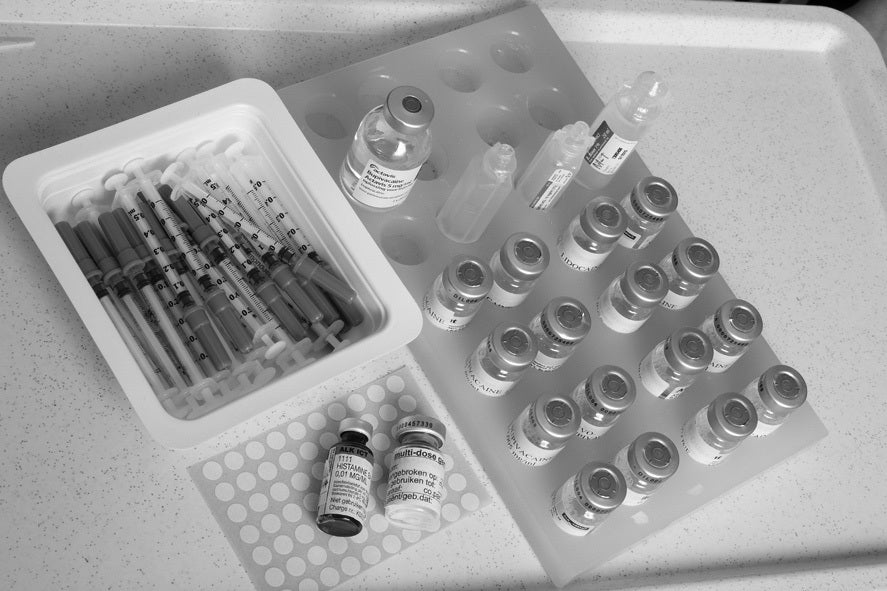 Na 15 tot 20 minuten kijken we of de huid hier op reageert. Zo niet, dan wordt een iets hogere concentratie ingespoten en weer 15 tot 20 minuten gewacht. Zo nodig herhalen we dit meerdere keren.
