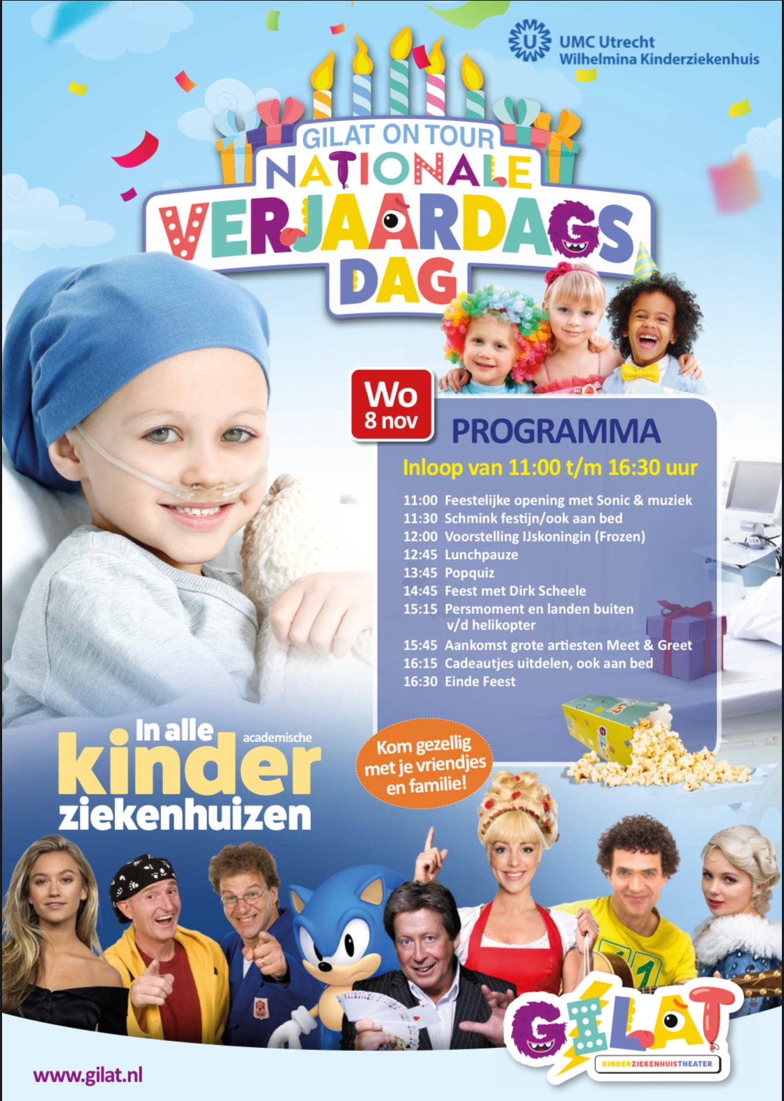 Een verjaarsdagsfeestje met vriendjes is vaak niet mogelijk voor kinderen die voor langere in het ziekenhuis liggen. Het programma op woensdag 8 november ontwikkelde Stichting Gilat speciaal om de kinderen een onvergetelijke dag te bezorgen met schminken, een voorstelling met de IJskoningin uit Frozen en een popquiz. Met als hoogtepunt de helikopter die landde, met aan boord artiesten Ernst & Bobby, Hans Kazan, Juf Roos en Sterre Koning.