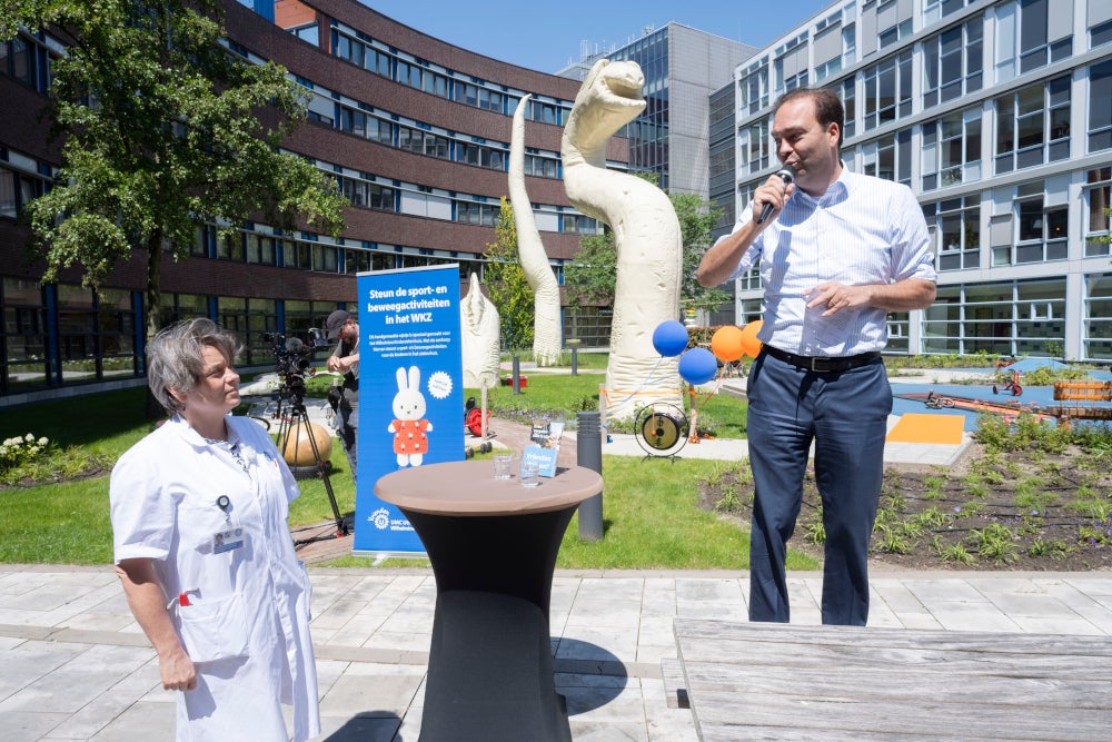 Frédérique van Berkestijn, medisch afdelingshoofd kindergeneeskunde: "Ik sta hier als trots mens. Deze prachtige binnentuin biedt zieke kinderen en hun broertjes en zusjes een plek om buiten te spelen, plezier te hebben én therapieën te volgen. Het is een fijne, groene plek waar ze even kunnen ontsnappen aan de hectiek van het ziekenhuis."